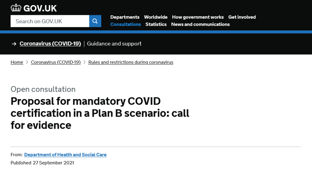 Proposal for mandatory COVID certification in a Plan B scenario: call for evidence https://www.gov.uk/government/consultations/proposal-for-mandatory-covid-certification-in-a-plan-b-scenario-call-for-evidence